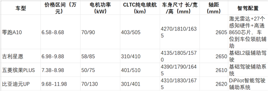 现在 10 万级纯电 SUV 市场的主力选手就是比亚迪元 UP 和吉利星愿,我把三台车主核心参数给大家列出来,一目了然:这么对比下来就很清楚了:零跑 A10 比吉利星愿便宜 1 万多,比比亚迪元 UP 便宜 3 万多,但是配置反而更高,尤其是智能化配置,直接比对手高了一个量级,性价比确实是独一档的存在。就像媒体说的那样:"10 万级的价格,敢对标 20 万级的智能化配置",真不是吹的。