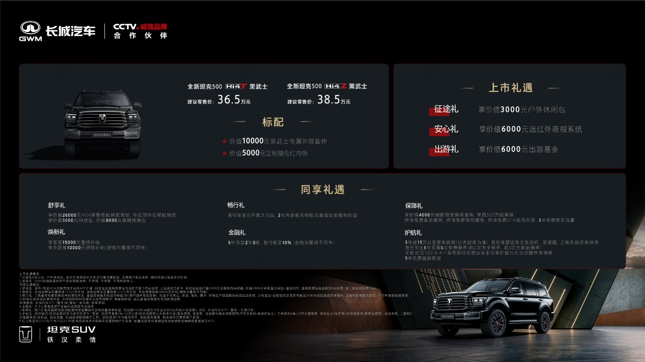 4月15日,全新坦克500黑武士正式上市,新车共推出两种不同动力架构版本,其中,全新坦克500Hi4-T黑武士版售价36.5万元,全新坦克500Hi4-Z黑武士版售价38.5万元,首批限量共500台。新车不仅标配价值10000元的黑武士专属外观套件,以及价值5000元的定制骏马红内饰,还同步推出包含价值6000元远红外夜视系统、3000元户外休闲包和6000元出游基金在内的多项上市尊享礼遇。