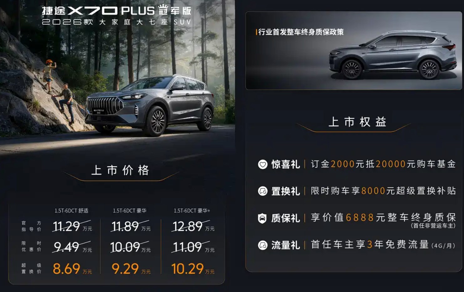 4月16日,买车网Buycar获悉,捷途品牌旗下中型SUV——2026款捷途X70 PLUS冠军版正式上市,新车共推出3款配置,售价区间为11.29万元-12.89万元,限时优惠价区间为9.49万元-11.09万,超级置换价区间为8.69-10.29万。